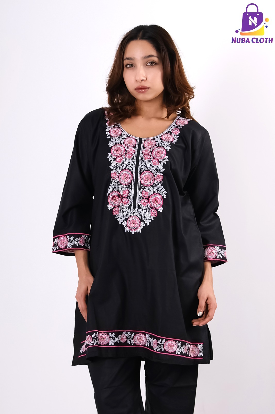 Upgrade your festive wardrobe with our Elegant Noir Pink Embroidered Cotton Kurti Set, a beautiful blend of traditional craftsmanship and modern style. This stunning outfit features a classic deep black base decorated with delicate pink and white floral embroidery across the neckline, sleeve borders, and hemline, creating a graceful and sophisticated look.