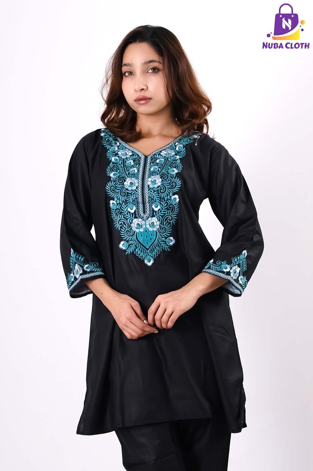 Step into timeless elegance with our Midnight Azure Embroidered Cotton Kurti, designed to bring the perfect combination of sophistication, comfort, and festive beauty. This stunning kurti features a deep classic black base highlighted with beautiful turquoise blue floral embroidery along the neckline and sleeve borders, creating a refined and graceful look.