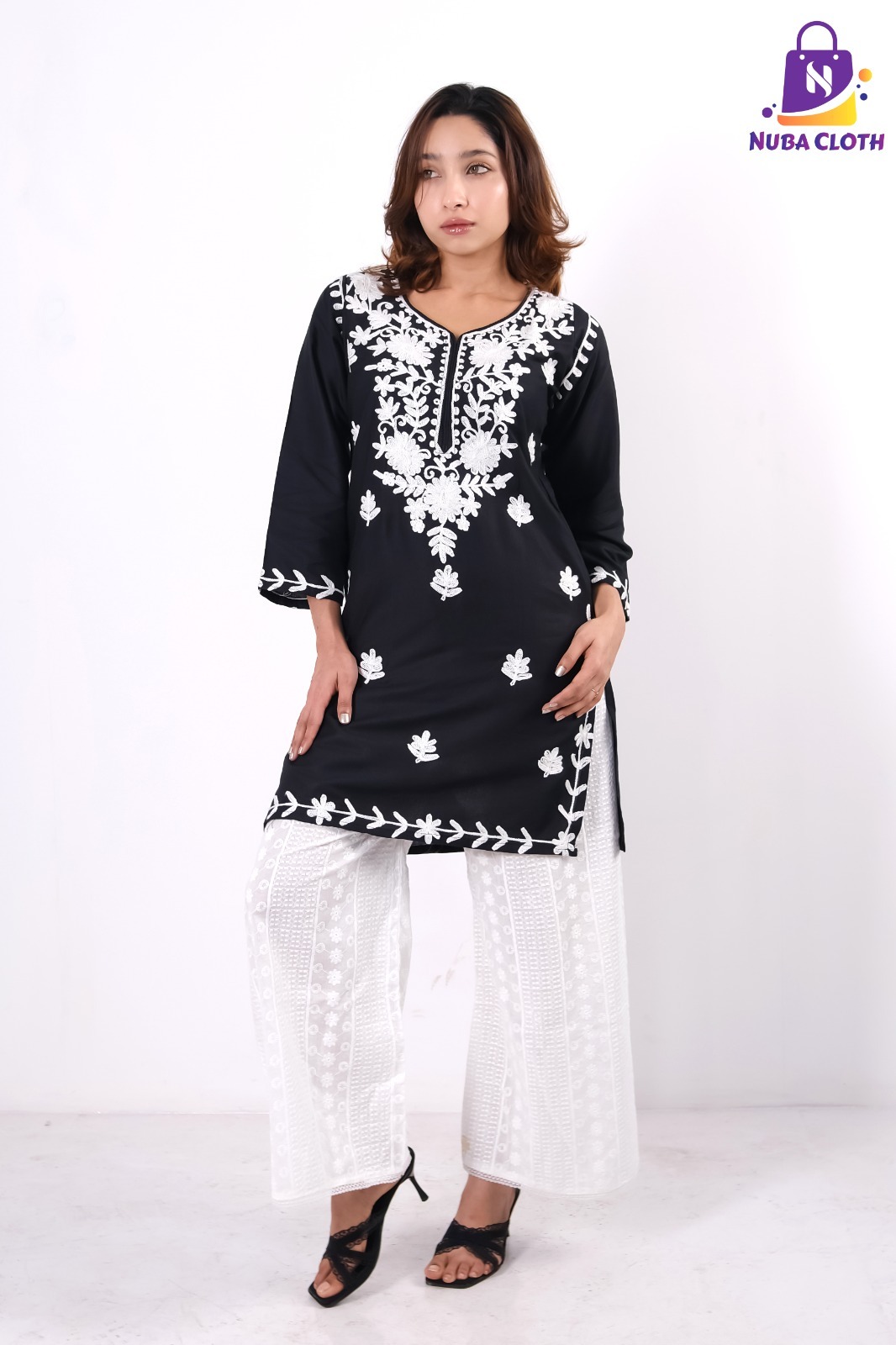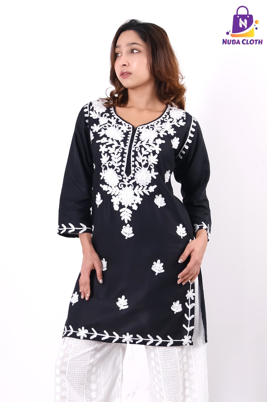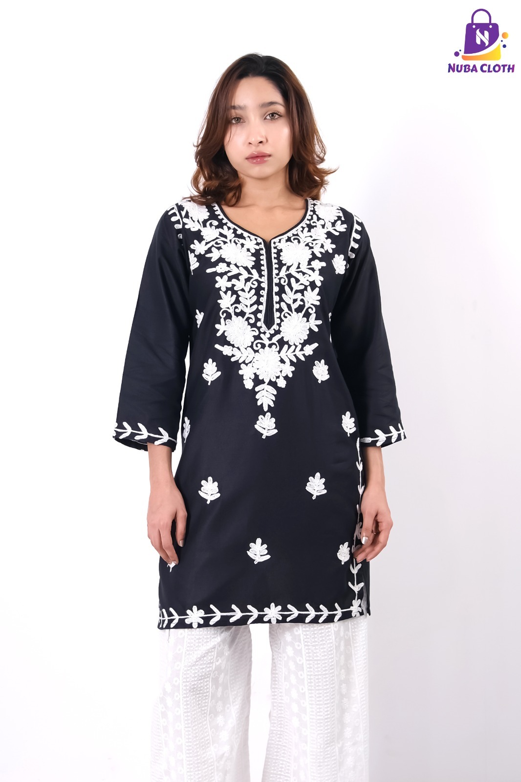 Embrace the timeless allure of deep black contrasted with pure white artistry this festive season. Our Midnight Flora Soft Cotton Kurti is a masterpiece of elegance, featuring a rich black base illuminated by intricate white floral embroidery that frames the neckline with royal grace. The design is further elevated by delicate white leaf motifs scattered across the front and stunning vine-patterned borders on the sleeve cuffs and hemline.