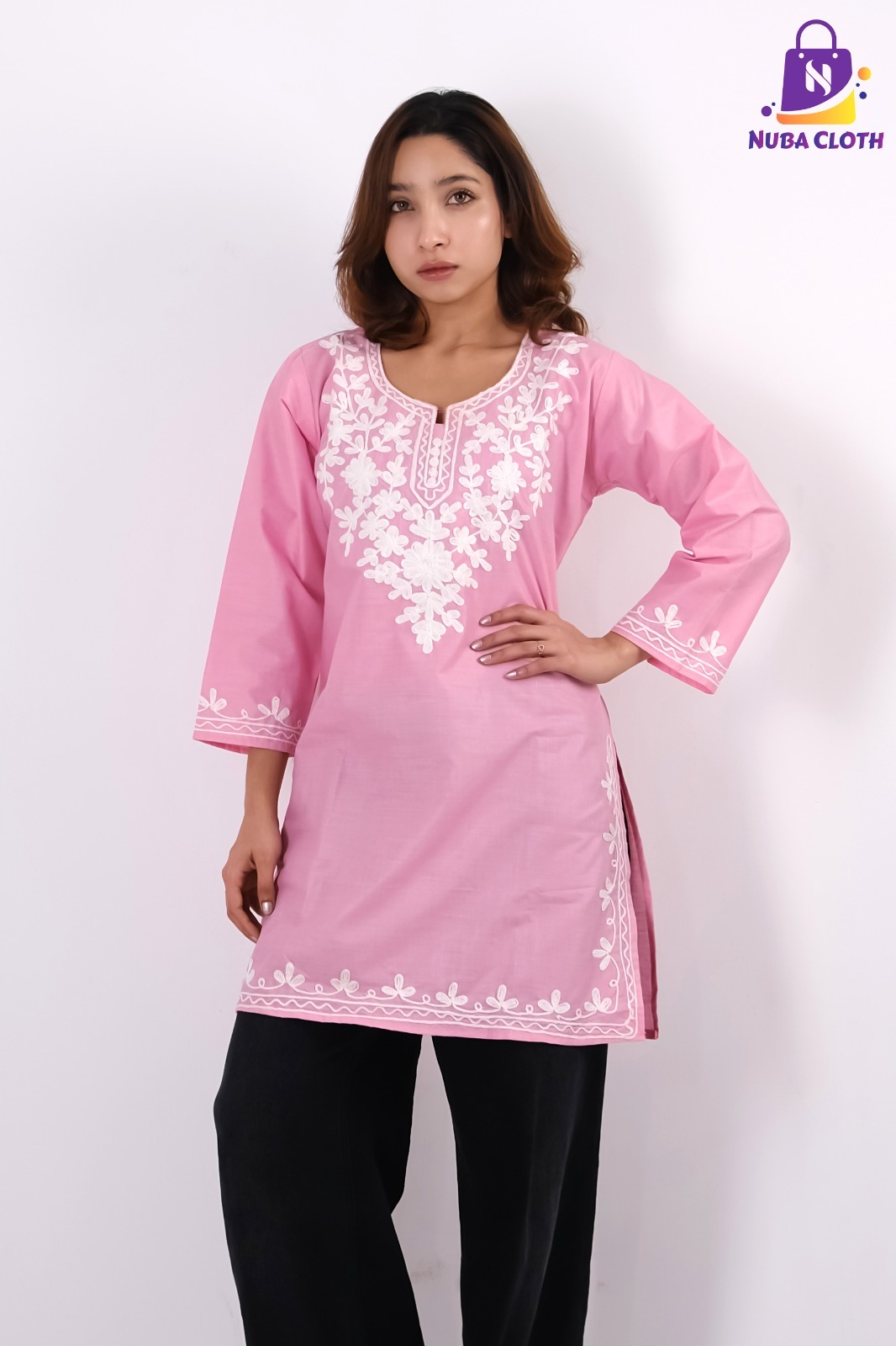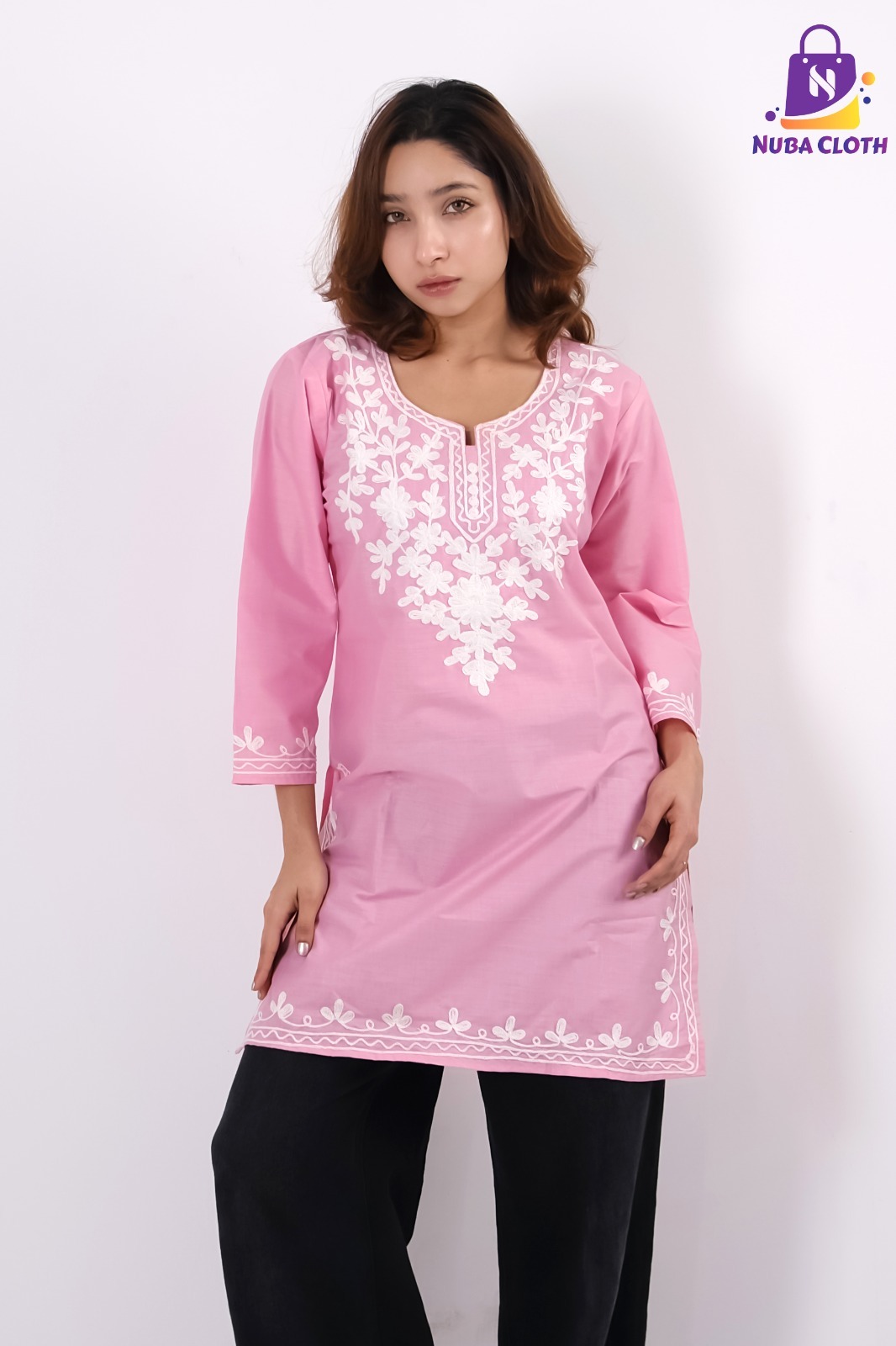 Radiate softness and charm with the Blush Petal kurti, a refreshing rose-pink ensemble designed for those who appreciate feminine grace. This Soft Cotton Kurti features a wide, face-framing white floral embroidery at the neck that adds an instant glow to your festive look. The standout feature of this Ladies Cotton Dress is the beautifully embroidered scalloped borders running along the side slits and the bottom hem, giving it a high-end designer finish.
