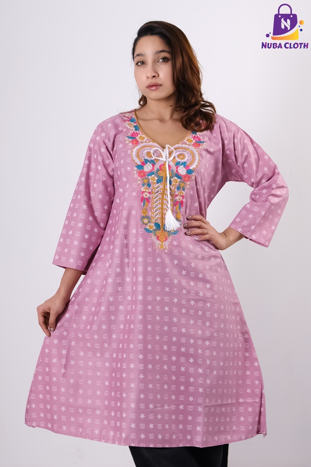 Discover the perfect blend of artistic detail and modern style with the Mauve Harmony kurti. This stunning mauve Soft Cotton Kurti is designed for the trendsetter, featuring vibrant multi-colored chest embroidery in shades of teal, gold, and pink. The look is finished with a trendy handcrafted white braided tassel at the V-neckline and a subtle all-over micro-print that adds premium texture to the entire Ladies Cotton Dress.